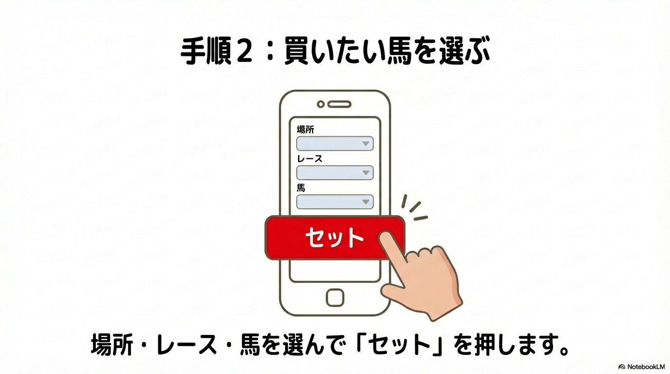 | STEP 2 | 開催場所とレース番号を選択 | 当日開催されている全てのレースから自由に選べます。 |