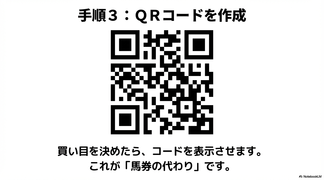 | STEP 6 | 内容を確認してQRコードを表示 | 1つのQRコードに最大50点までの買い目を集約可能です。 |