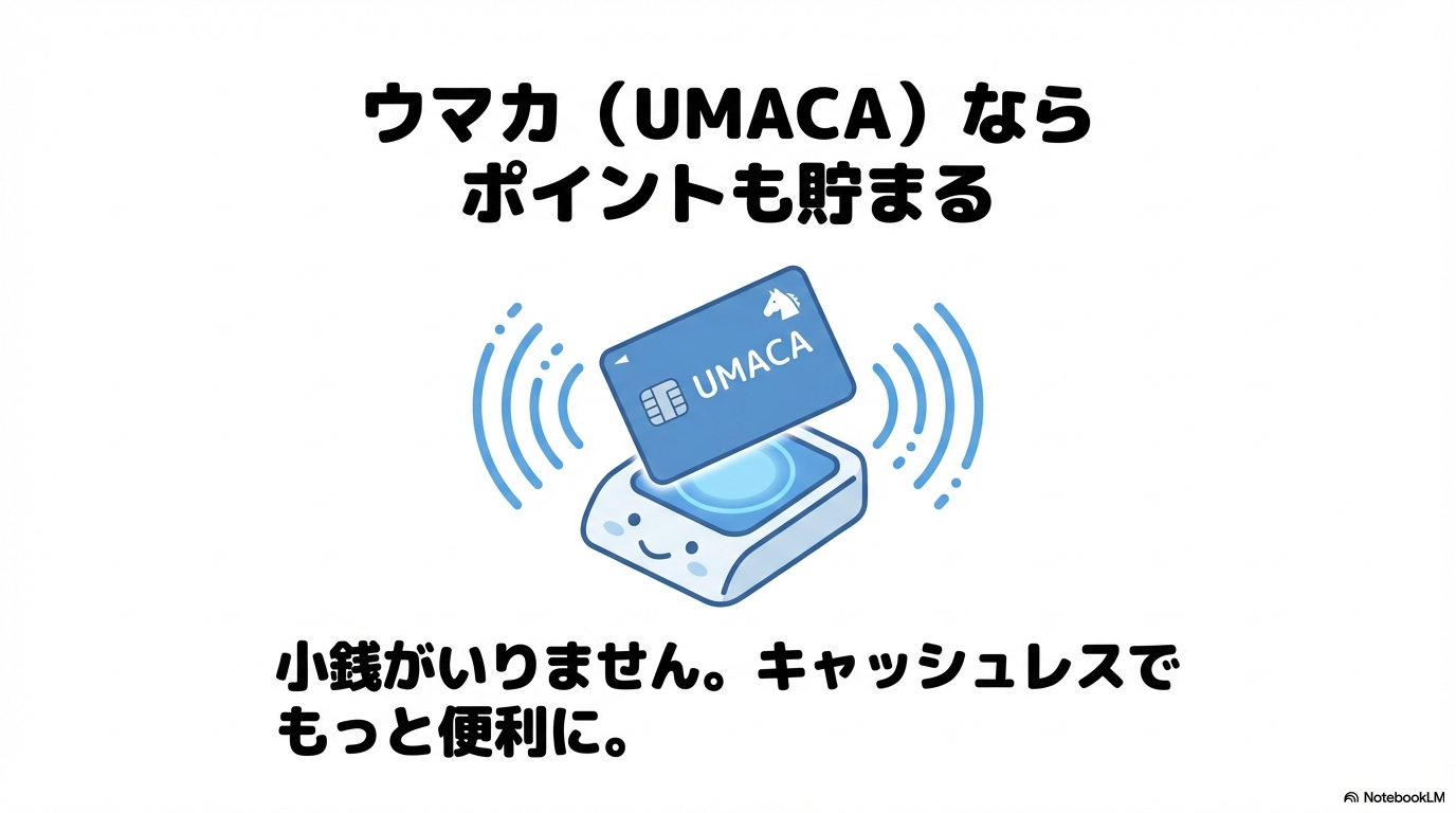 - キャッシュレス: UMACAと組み合わせて、現金いらず&ポイント獲得