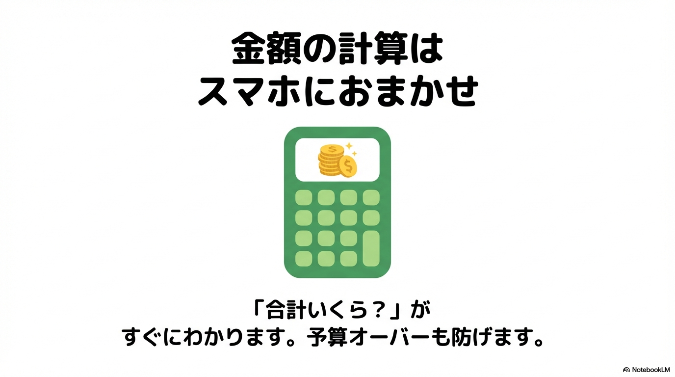 - 合計金額の自動計算!「あと何点買えるかな?」と計算しなくても、予算オーバーを即座に教えてくれます。