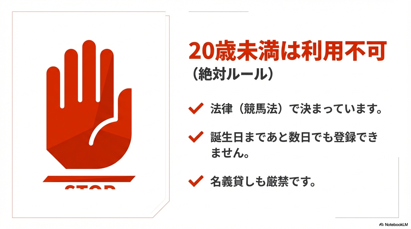 競馬は、サラブレッドの美しさや手に汗握るレース展開など、非常に魅力的なレジャーですね。しかし、大前提として絶対に忘れてはならないのが、「20歳」という年齢の壁です。日本の法律である「競馬法」に基づき、満20歳未満の方は即パットを含むすべての投票サービスを利用することができません。これはJRAが独自に決めたマナーのようなものではなく、国家が定めた法律による厳格な制限なんです。