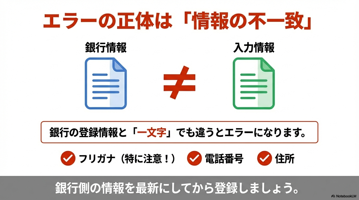 1. 銀行側の登録情報と1文字でも違うと認証されない