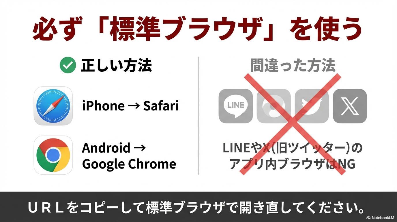 即パットの登録システムは非常にデリケートです。JRAの公式サイトでもアナウンスされていますが、推奨環境を守らないと情報の受け渡しがうまくいかずにエラーになります。iPhoneならSafari、AndroidならGoogle Chromeの最新版を使うのが絶対条件と言っても過言ではありません。よくある失敗例として、LINEやX(旧Twitter)のリンクからそのまま開いた「アプリ内ブラウザ」で手続きを進めてしまうケースがありますが、これは非常に高い確率でエラーになります。必ず一度URLをコピーして、標準のブラウザアプリで開き直してくださいね。
