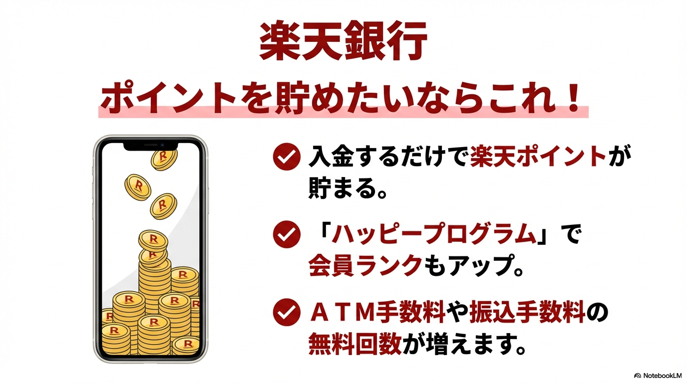 こうした「隠れコスト」を完全にゼロにするためには、楽天銀行の「ハッピープログラム」や住信SBIネット銀行の「スマートプログラム」をフル活用するのが一番の近道です。例えば、楽天銀行なら即パットへの入金がポイント付与の対象になるだけでなく、取引件数としてカウントされるため、ATM手数料の無料回数を増やすための「ランク上げ」に競馬を利用できてしまうんです。