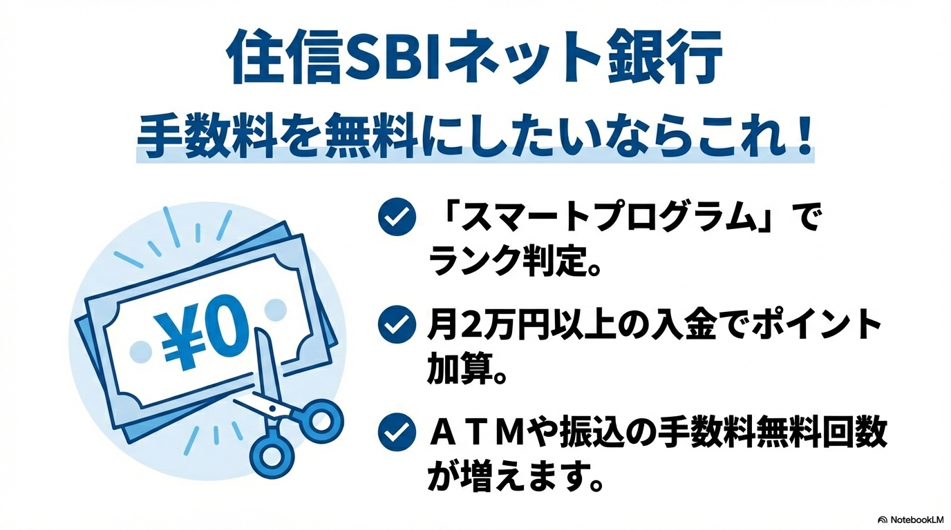 | 銀行手数料を無料にしたい | 住信SBIネット銀行 | 入金実績がランクアップ(スマプロ)の判定対象になる |