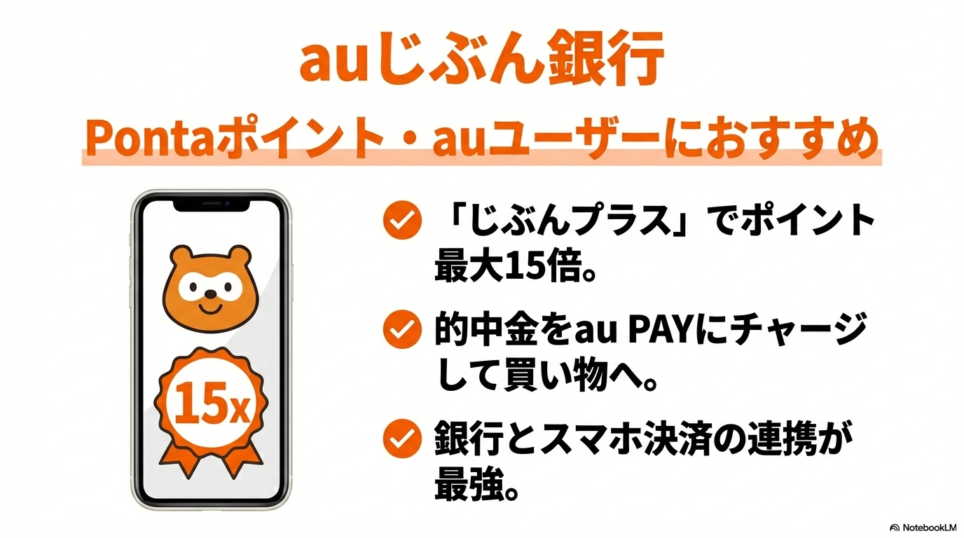 | Pontaポイント/au PAY愛用 | auじぶん銀行 | 「じぶんプラス」で最大15倍のポイント還元 |