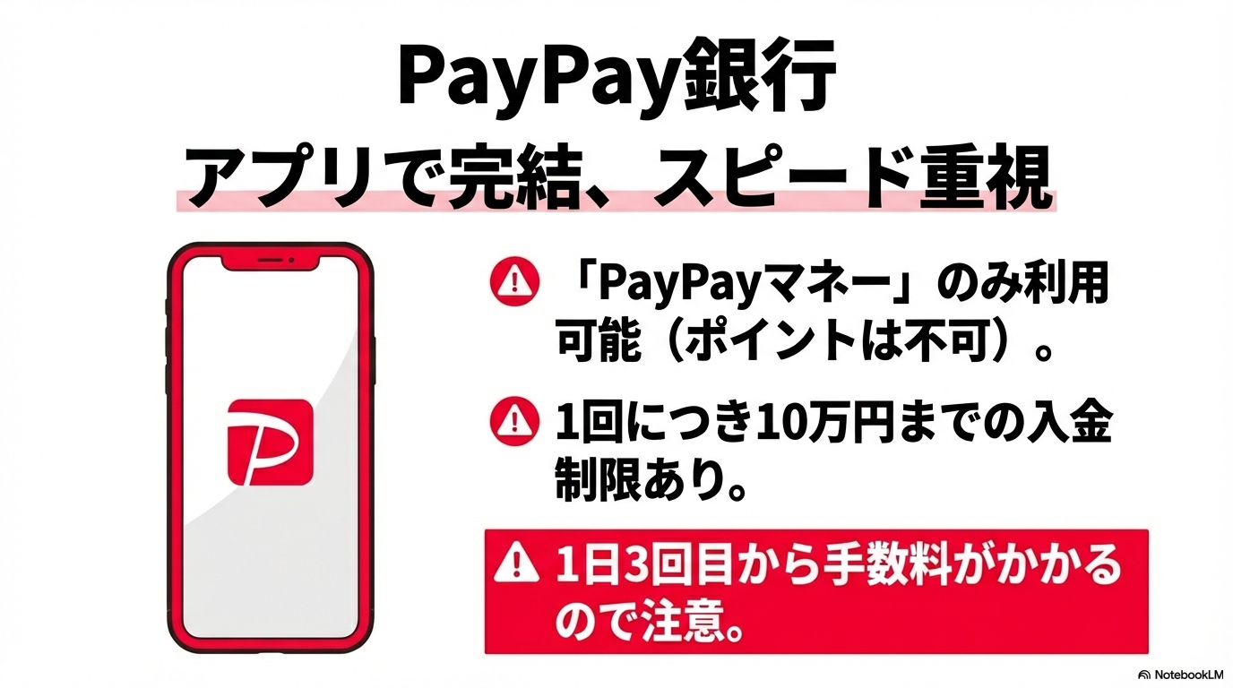しかし、PayPay銀行を利用する際には、いくつかの注意点も理解しておく必要があります。まず、多くのネット銀行が「入金でポイント付与」を行っているのに対し、PayPay銀行での即パット入金は「PayPayポイント付与の対象外」であり、PayPayステップのカウントにも含まれません。つまり、ポイ活的なメリットは他行に比べると控えめです。さらに、前述した通り「1日3回目以降の入金には15円の手数料」がかかります。これを避けるためには、その日に使う金額を朝のうちに一括でチャージしておくなどの工夫が必要ですね。