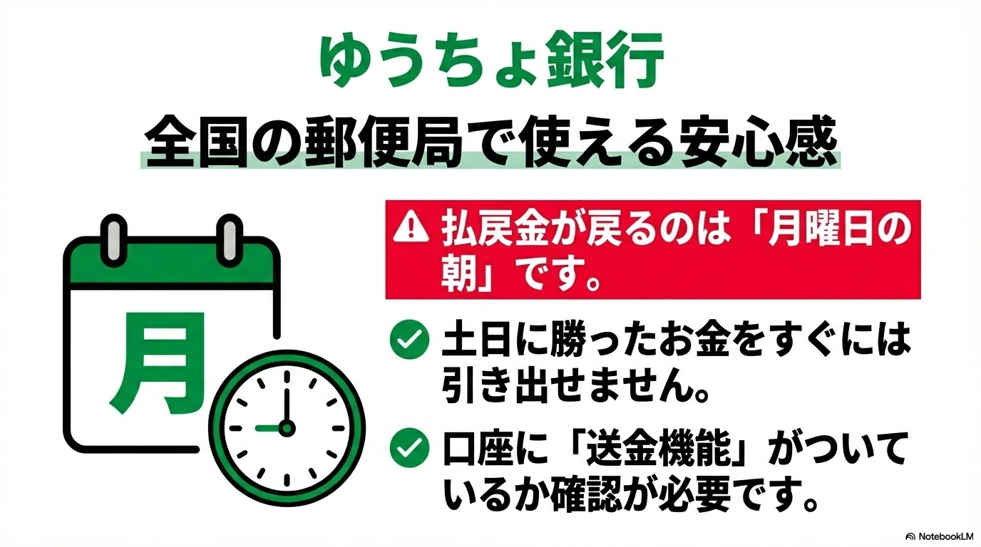 一方で、本格的に競馬を楽しみたい方にとって最大のネックとなるのが「払戻金の出金タイミング」です。ここが楽天銀行や住信SBIネット銀行などのネット銀行と大きく違う点なんです。通常、即パットのシステムでは週末の開催が終わると、的中して残っている残高が銀行口座へ戻されます(一括出金)。多くの銀行が「日曜日の深夜」までにこの処理を完了させるのに対し、ゆうちょ銀行の場合は「翌営業日(通常は月曜日)の午前9時30分」まで時間がかかってしまいます。日曜の夜に勝利の余韻に浸りながら資金を動かしたいと思っても、ゆうちょ銀行だともどかしく感じるかもしれません。正確な一括出金のスケジュールは(出典:日本中央競馬会『即PAT(ネット馬券購入)』利用ガイド)で公表されていますが、月曜日の朝まで待つ必要がある点は覚えておきましょう。