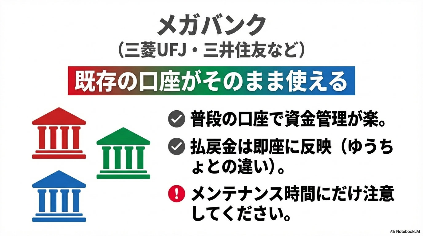 | 信頼性・新規開設したくない | 三菱UFJ / 三井住友 / ゆうちょ | 既存口座を流用可能で、出金反映もメガバンクなら最速級 |