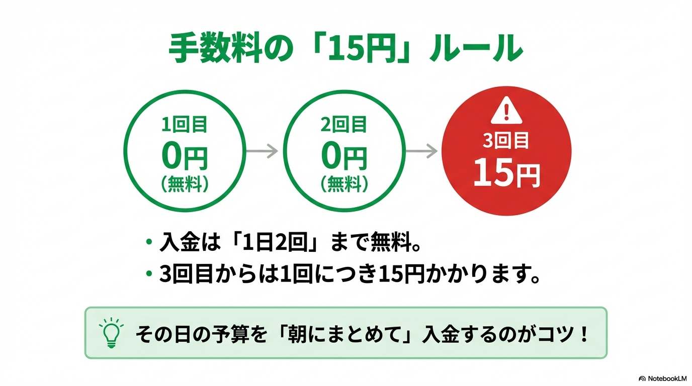 1日あたり2回目までは手数料は無料ですが、3回目以降は、1回につき15円(税込)の手数料がかかります。この手数料は入金金額とは別に、銀行口座から直接引き落とされる仕組みです。