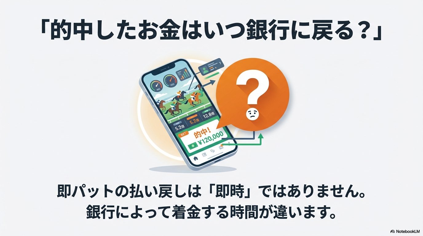 週末の競馬、楽しんでいますか。的中したときの喜びは格別ですが、ふと口座を確認して、即パットの払い戻しが自動で戻っていないと不安になりますよね。反映されない理由は何か、手数料はかかるのか、いつ自分の銀行に振り込まれるのかなど、疑問は尽きないかなと思います。土曜日に的中した分がすぐに戻らない仕組みや、出金できないときのトラブル対処法についても、この記事で分かりやすく整理してみました。読んだ後は、安心しておいしいものを食べたり、次のレースの予想に集中したりできるはずですよ。
