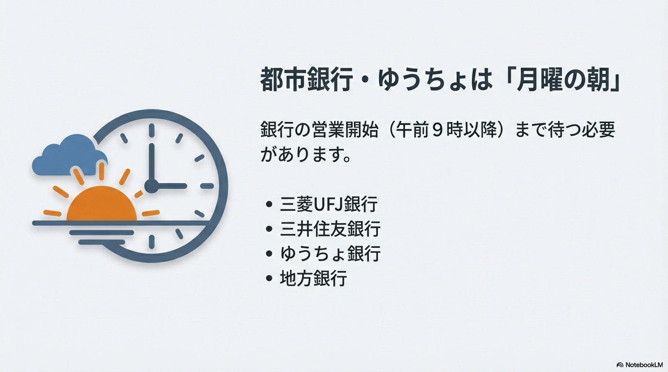 | ゆうちょ銀行 | 月曜 9:30頃 | 送金サイクルが固定。深夜のメンテナンスに注意。 |