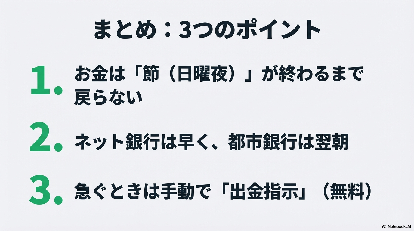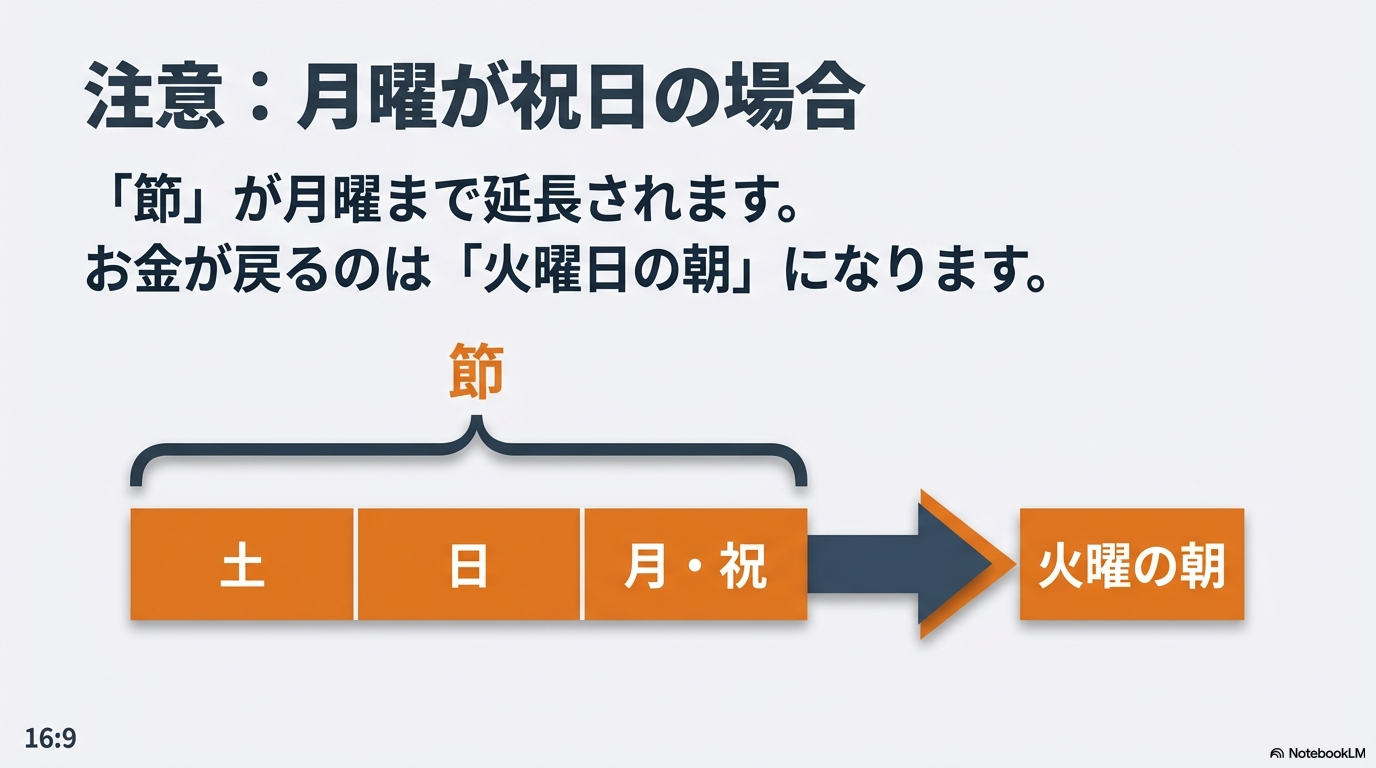 | ゆうちょ銀行 | 節最終日の翌日(通常月曜)9時30分まで | 安定していますが、月曜朝まで待機が必要です。 |