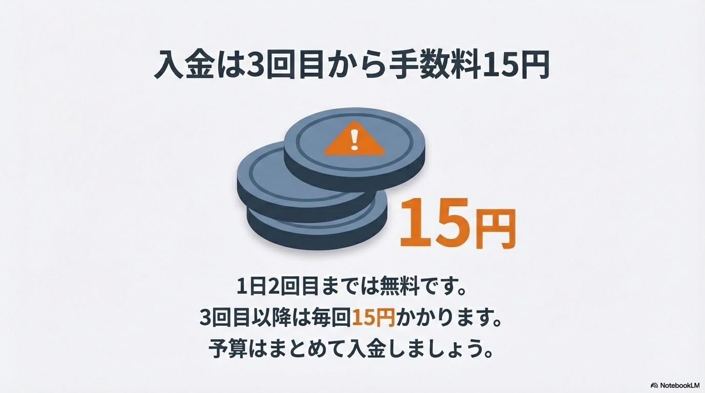 一方で、注意が必要なのが「入金」の際の手数料です。即パットへの入金は、1日あたり2回目までは無料ですが、3回目以降は1回につき「15円(税込)」の手数料が発生します。