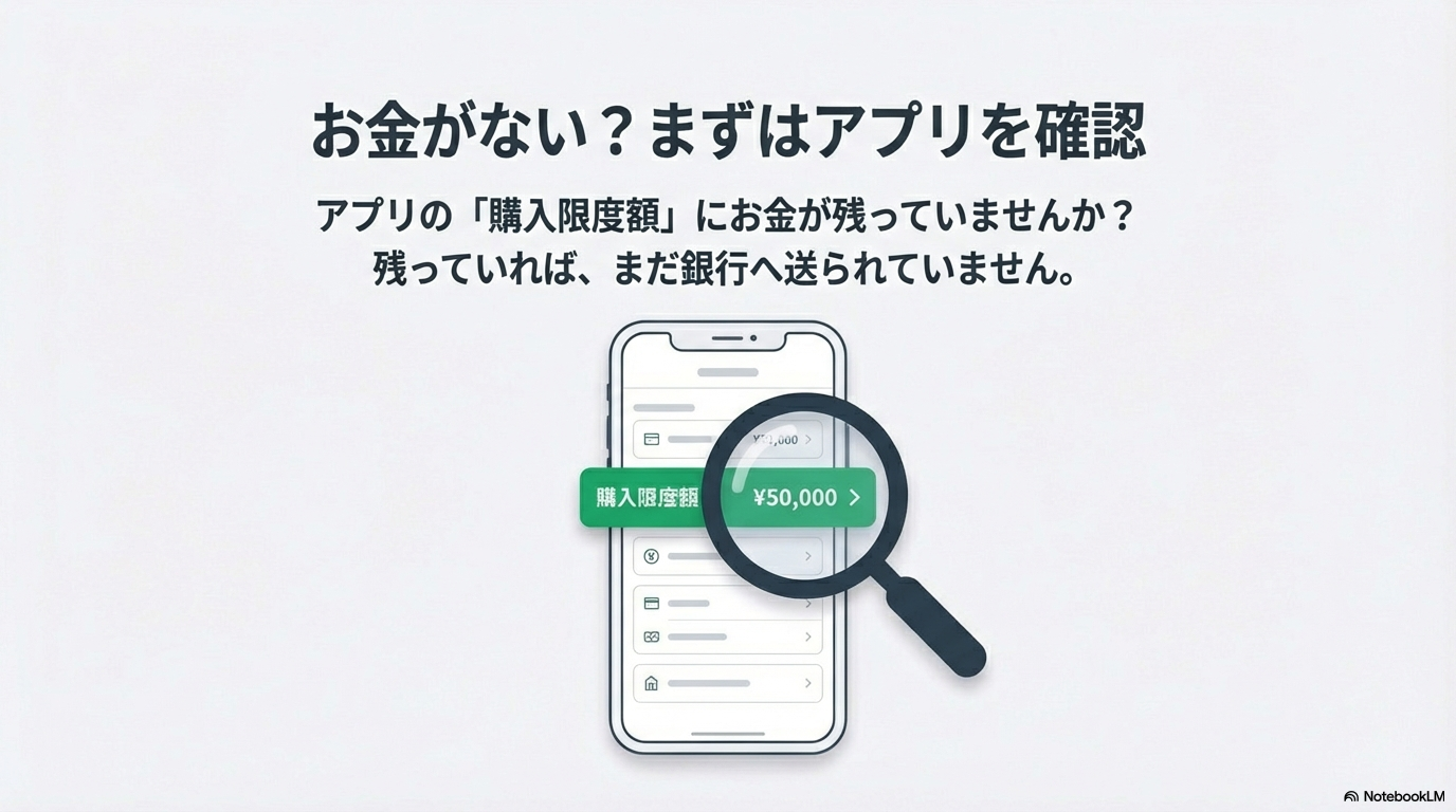 | 購入限度額が0円になっている | 銀行の入出金明細 | 銀行側の処理待ち、またはメンテナンス中 |
