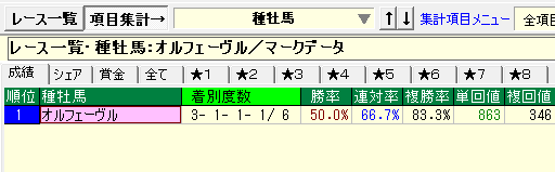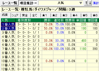 • 牡馬【4-1-1-6/12】勝率33%・連対率41%・複勝率50%・単回231円複回100円