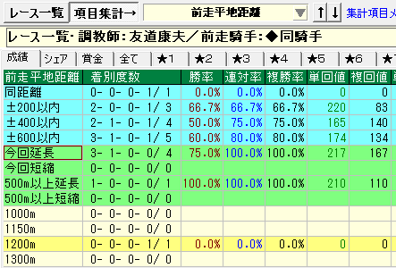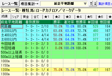 更に今回距離1,200mにしぼると【2-1-1-0/4】勝率50%・連対率75%・複勝率100%・単回395円複回285円