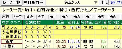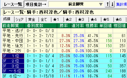 4. 西村淳也騎手⇒牡馬①前走上がり1~5位②前走新馬クラス