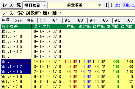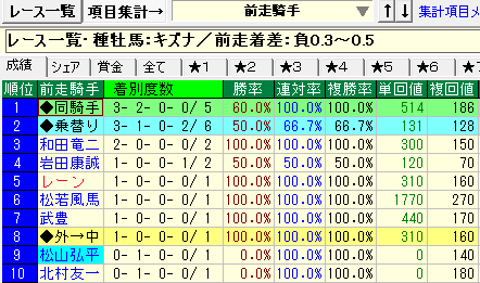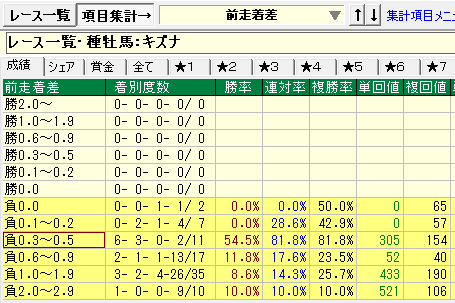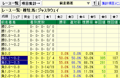 - 前走負け着差0.0~0.5の成績が優秀。