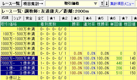 - 友道厩舎⇒牡馬で今回距離2,000mで市場取引価格5,000万〜3億未満。