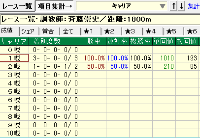 - 斉藤崇厩舎⇒①今回距離1,800m②キャリア1戦③前走から乗り替わり