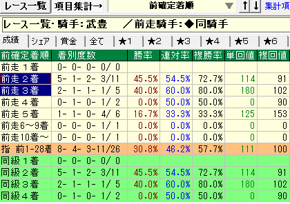- 上記条件で前走から継続騎乗の成績が優秀。