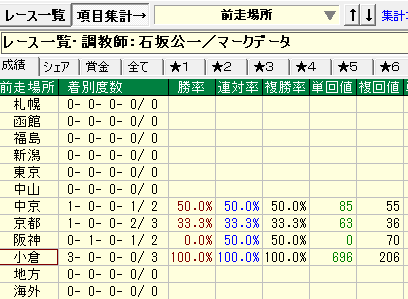 - 石坂厩舎⇒前走負け着差0.0~0.5で前走場所が小倉。
