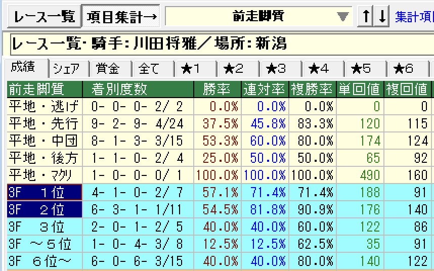 - 川田将雅:新潟開催、前走上がり3F=1〜2位、前走開催が東京 or 中京 → 勝率90%・複勝率100%・単回収314円