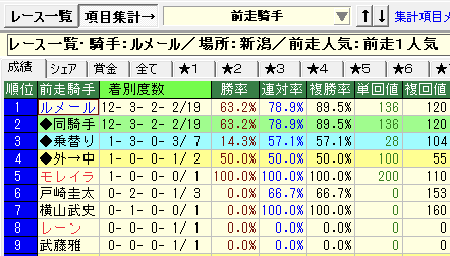 - ルメール騎手⇒①新潟競馬場②前走1番人気