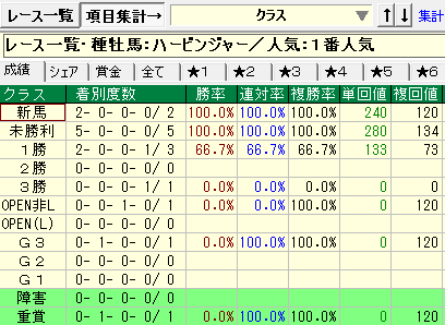 - ハービンジャー産駒(牡馬):1番人気、新馬・未勝利 → 高成績傾向。