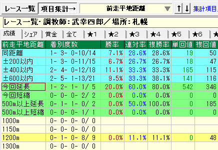 - 武幸四郎厩舎⇒①札幌競馬場②今回距離延長③今回未勝利、1勝クラス