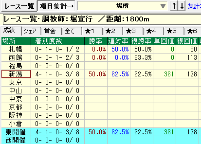 - 堀厩舎⇒①新潟競馬場②距離1,800m③前走上がり1位