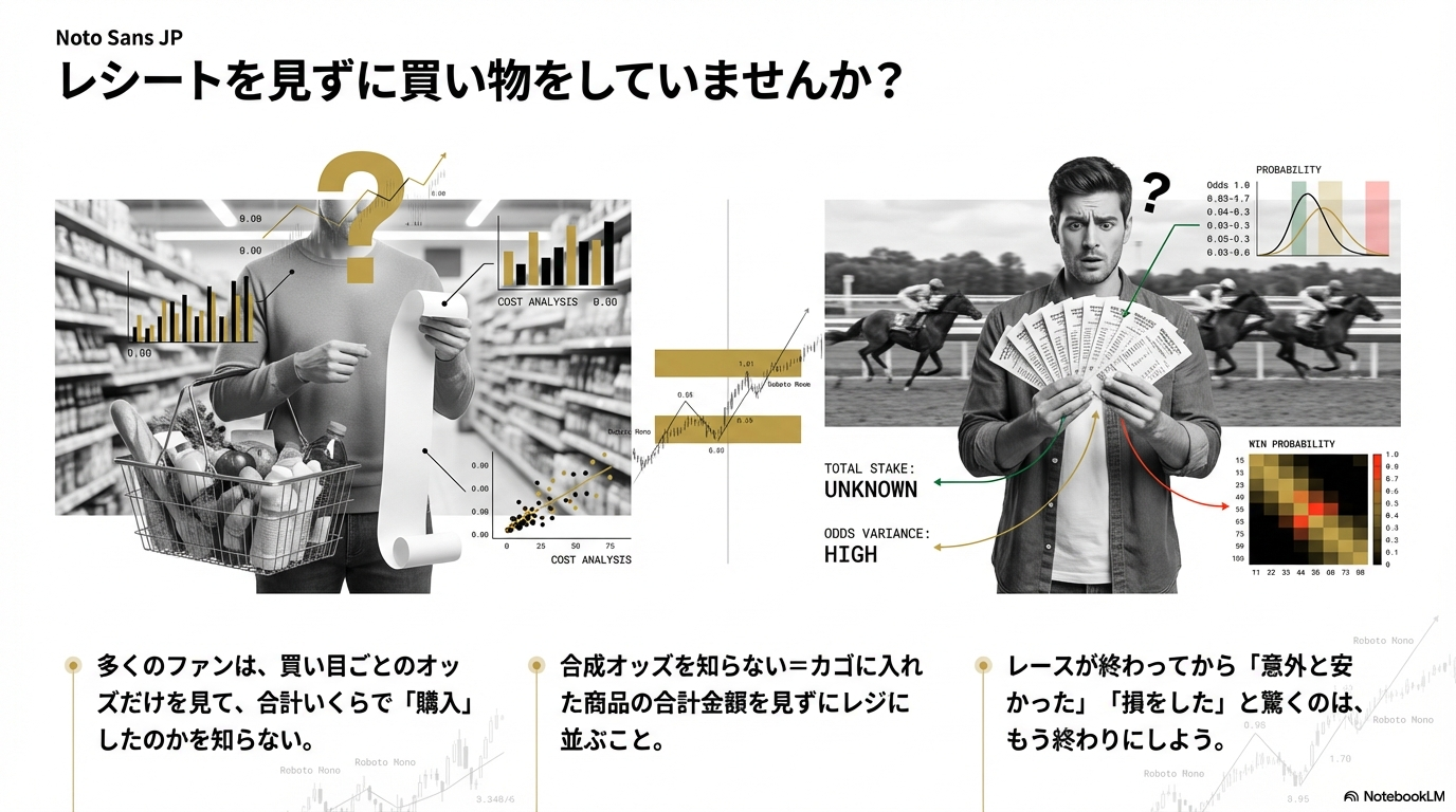 「合成オッズを知らない」ということは、スーパーで買い物をするときに、カゴに入れた商品の合計金額を見ずにレジに並ぶようなものです。レジ(レース結果)を通してから「えっ、こんなに安いの(高いの)?」と驚くのはもう終わりにしましょう。