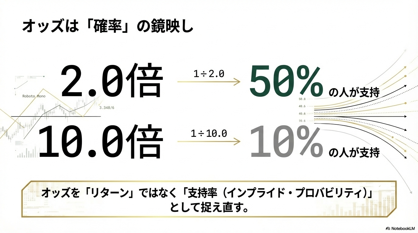 通常、私たちはオッズを「当たったら何倍になるか」というリターンの指標として見ています。しかし、これを逆数(1 ÷ オッズ)にすると、市場がその馬の勝利をどれくらい信じているかという「支持率(インプライド・プロバビリティ)」が見えてきます。