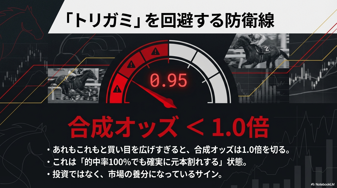 合成オッズが1.0倍を切っている状態とは、「的中率100%だとしても、確実に元本割れする」という状態です。オッズの歪みを狙うどころか、市場の養分になってしまっています。