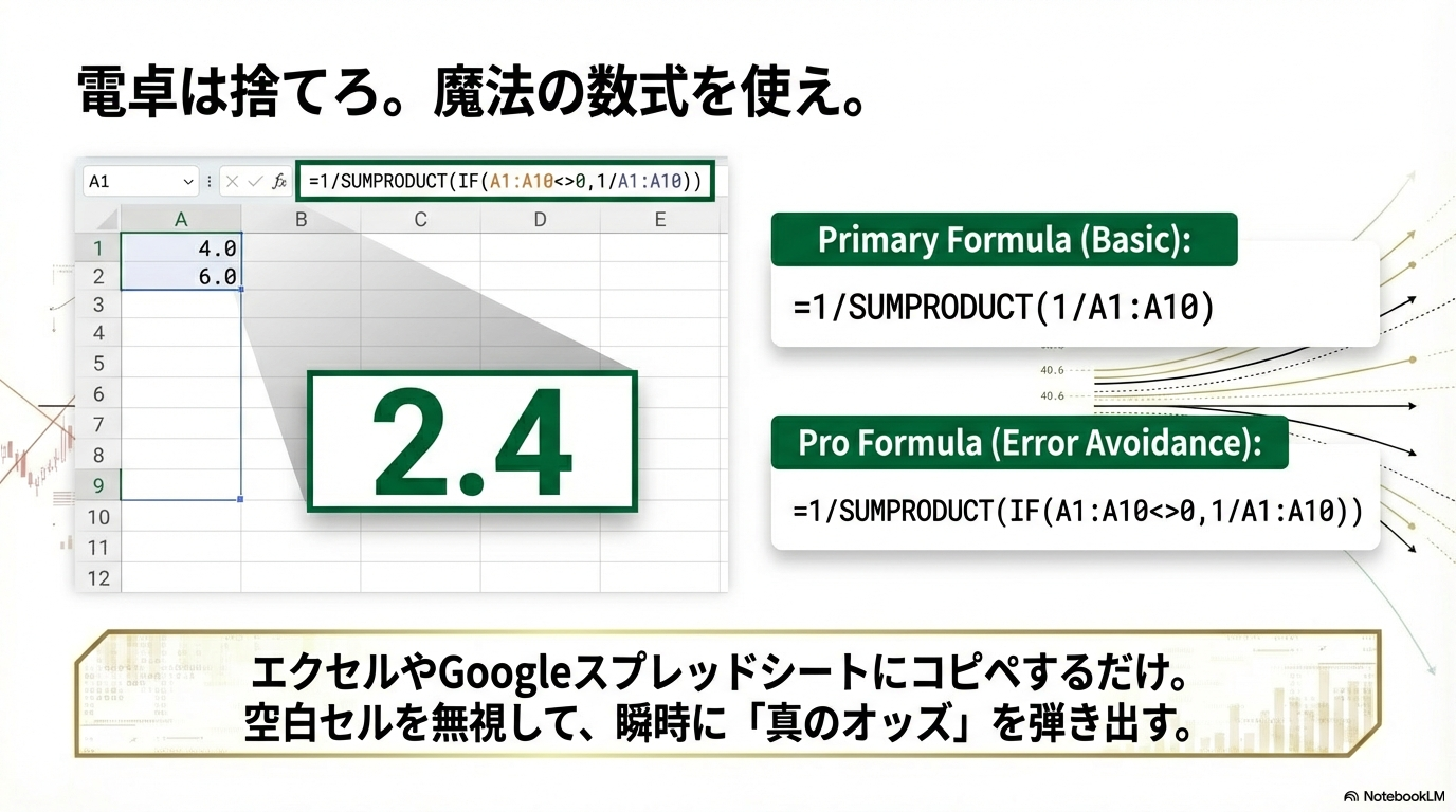 この数式を使えば、例えば「とりあえず10頭分の入力欄を作っておいて、今回は3頭だけ入力しよう」といった場合でも、残りの7つの空白セルを無視して正しく合成オッズを弾き出してくれます。