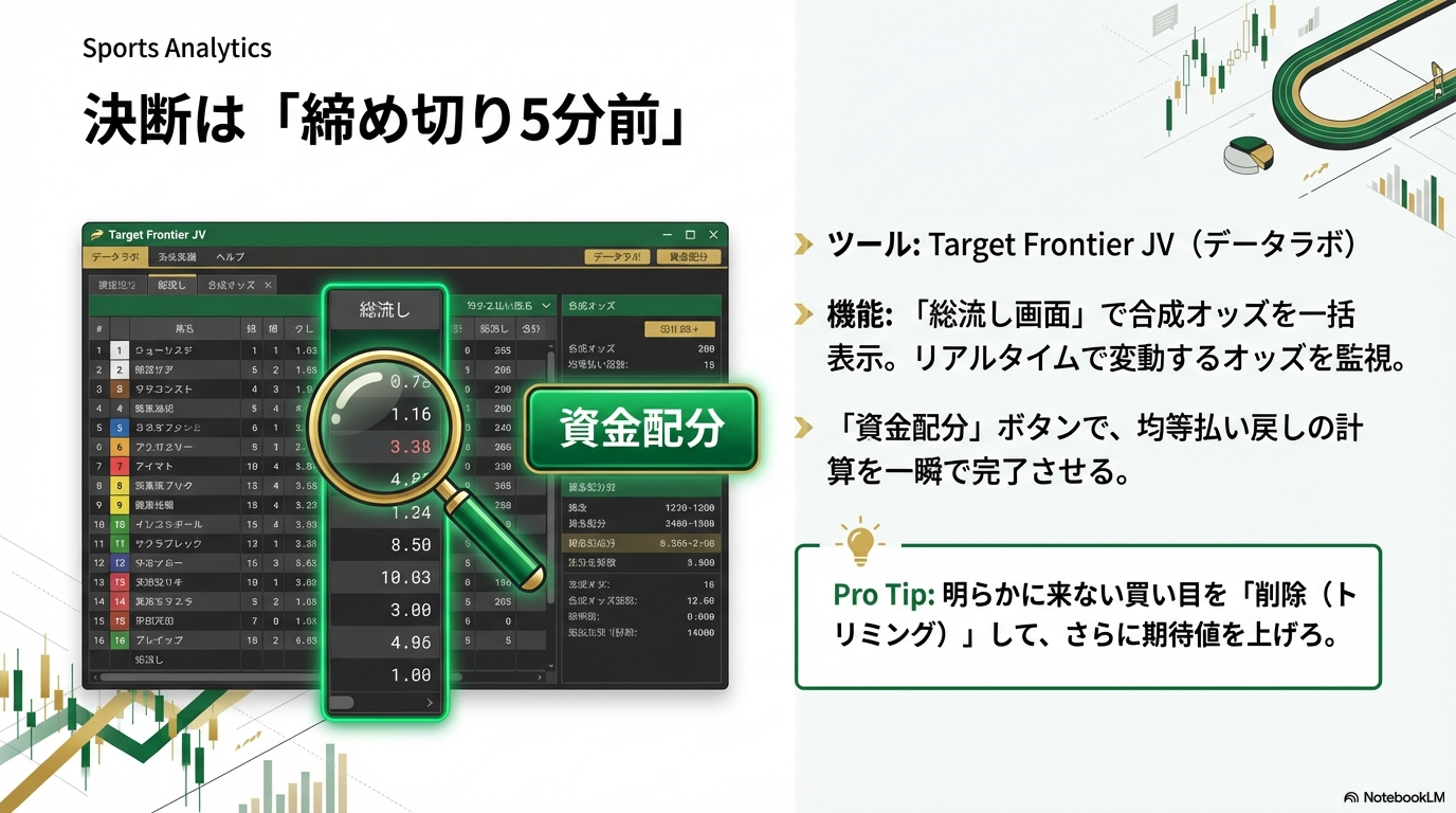 今回は「合成オッズの歪み」という、少しマニアックながらも極めて強力なテーマについて、計算方法からTarget Frontier JVを使った実践的な攻略法まで徹底的に解説してきました。かなりの長文になりましたが、最後までお付き合いいただき、本当にありがとうございます。
