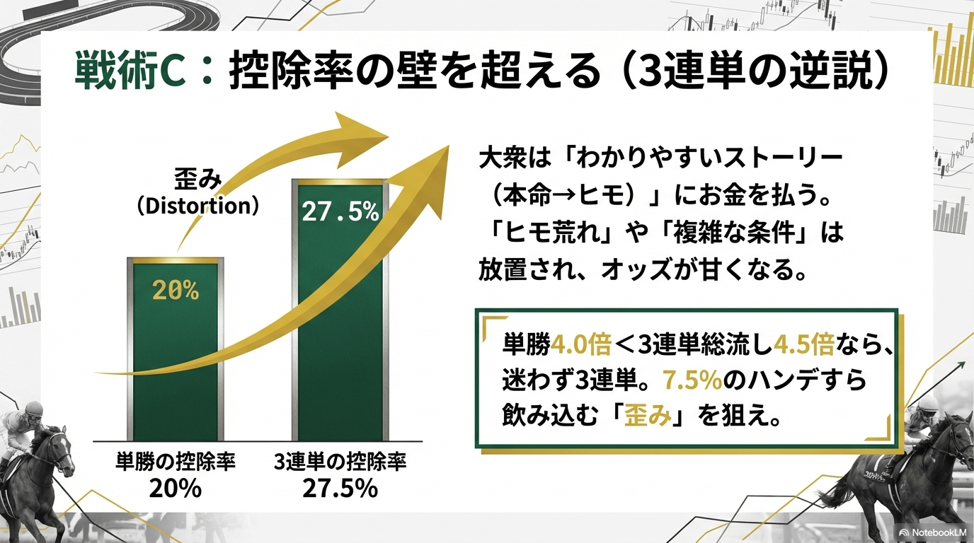 「どの馬が来るか」よりも「どの券種が最も割安か(歪んでいるか)」を探す視点を持つこと。 - 合成オッズは武器であり防具: