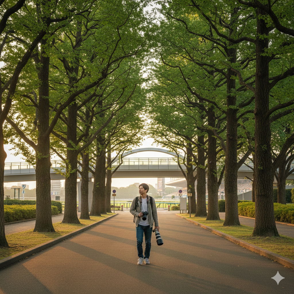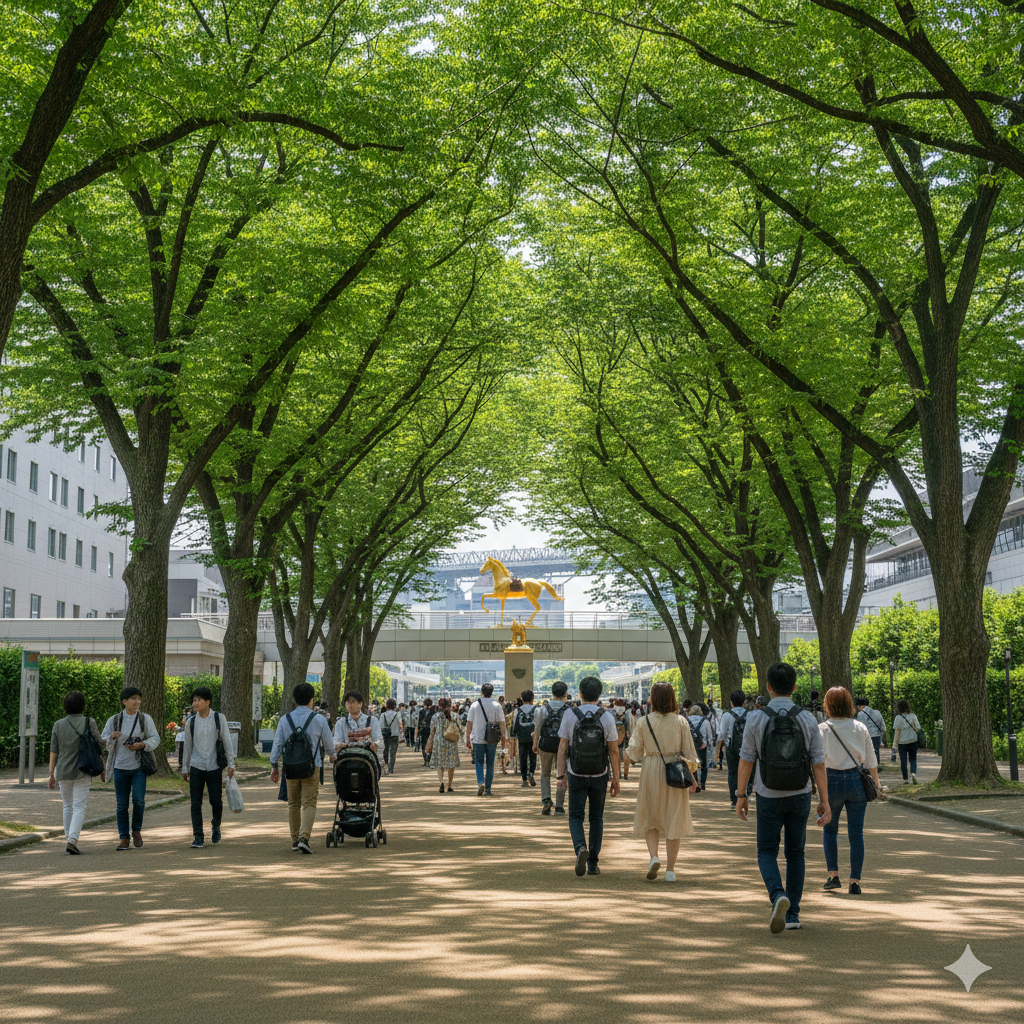 私がこのホテルを推す最大の理由は、単に近いだけでなく、移動ルートが素晴らしいからです。ホテルから競馬場へ向かう道中には、国の天然記念物にも指定されている「馬場大門(ばばだいもん)のケヤキ並木」があります。美しい緑のトンネルを抜け、歩行者専用のスカイデッキを渡れば、信号待ちや交通事故のリスクを最小限に抑えて正門へ到着します。重い望遠レンズを抱えたカメラマンの方や、ベビーカーを押すファミリーにとっても、このストレスフリーな動線は涙が出るほどありがたいはずです。