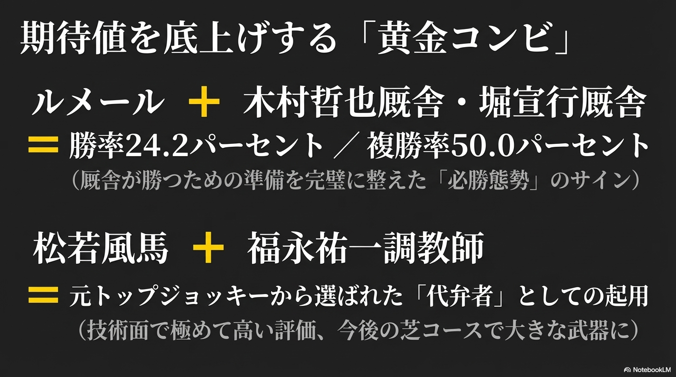 | C.ルメール | キタサンブラック | 38.5% | 69.2% | 115% | 産駒が持つ豊富なスタミナと持続力を、道中で完璧に温存させ、長い直線で最大限に引き出す。まさに芸術的なコンビネーションです。 |
