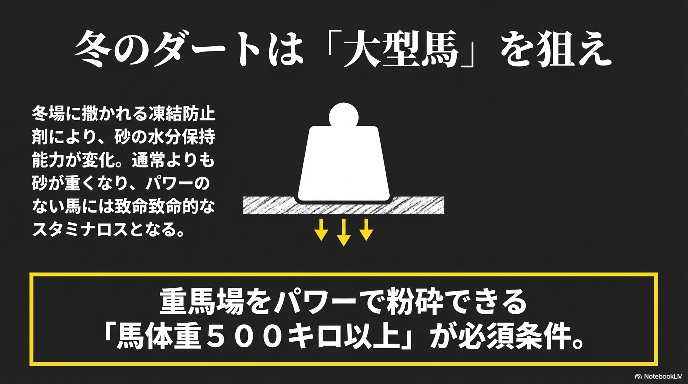 JRAが発表する馬場状態には「良」「稍重(ややおも)」「重(おも)」「不良」の4段階があります。馬場が「重」や「不良」になると、スピード自慢の馬はその自慢の切れ味を削がれ、代わりに馬場の悪さを苦にしないパワーとスタミナ、そして精神的な強さを持つ馬が台頭してきます。なぜなら、ぬかるんだ馬場は脚にまとわりつき、一歩ごとに大きく体力を消耗させるからです。このような過酷な状況でこそ、馬が生まれ持った血統的な背景が、そのパフォーマンスを大きく左右するのです。