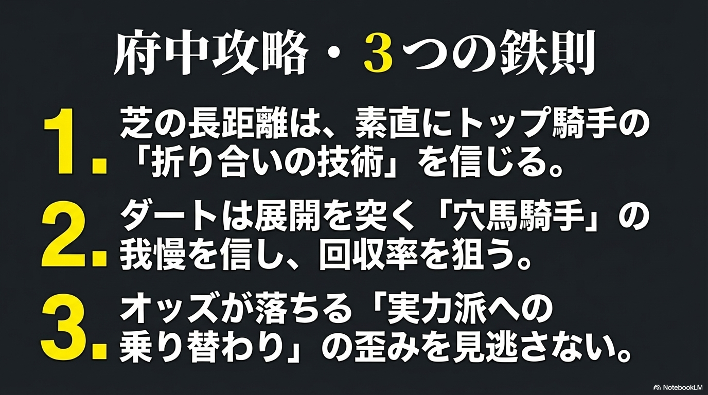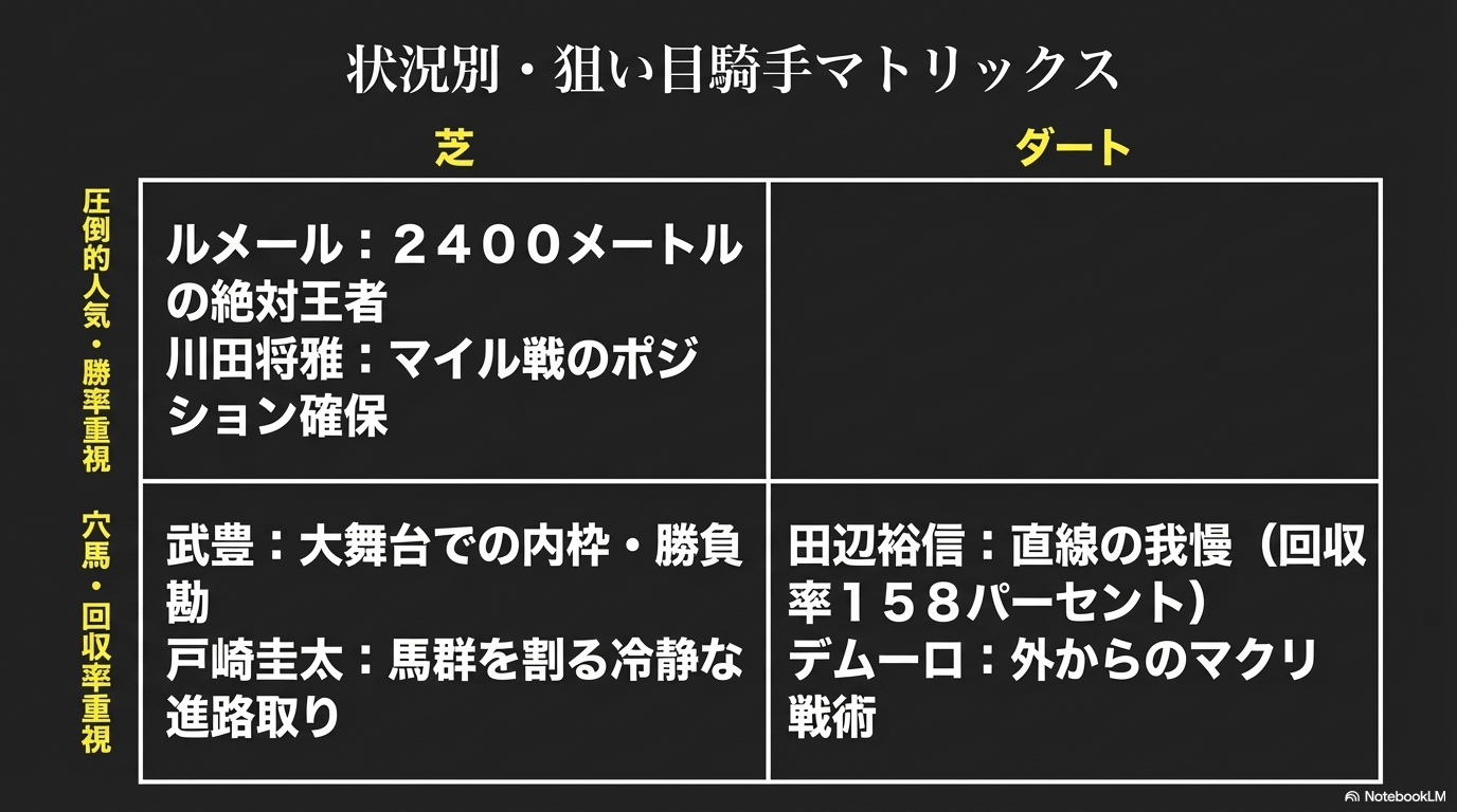 東京2400mは、騎手の持つ技術、知性、経験、そして精神力の全てが試される究極の舞台です。馬券を検討する際には、単に馬の能力だけでなく、どの騎手が自分の馬を最も巧みにエスコートし、勝利へと導くことができるのかを想像することが、的中への鍵となるでしょう。