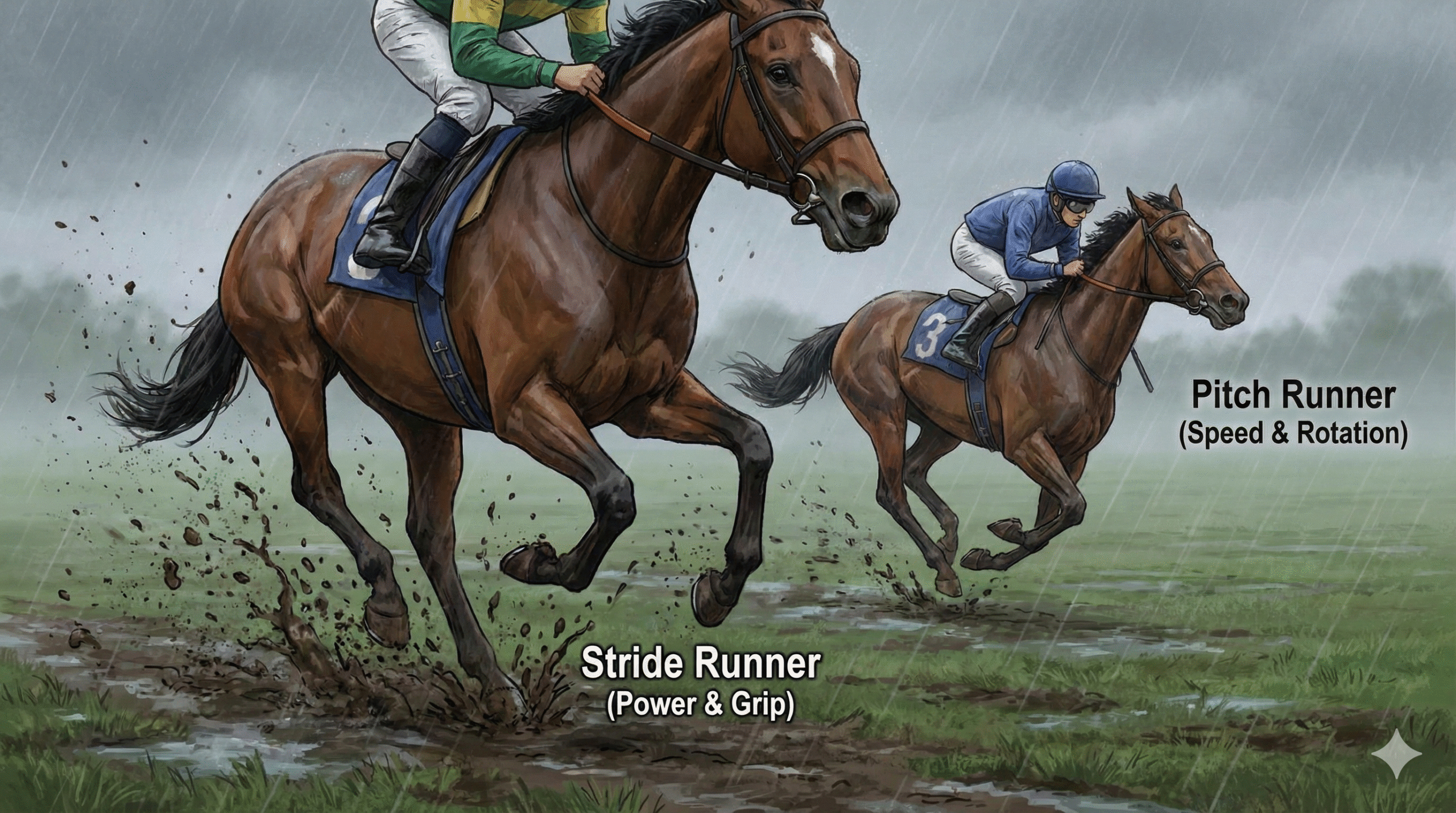 良馬場の東京1400mは、ラストの瞬発力(キレ)が勝負を分けますが、水分を含んだタフな馬場になると、地面をしっかりと掴んで推進力に変える「パワー」と「掻き込む力(グリップ力)」が最重要項目になります。スピードの絶対値が削がれる分、泥臭い消耗戦に強い血統が浮上してくるのです。