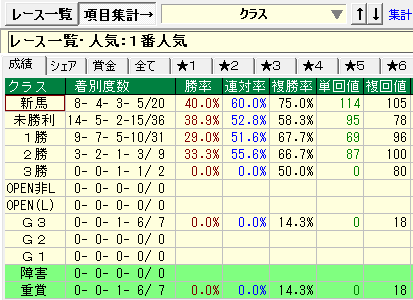 - この人気で今回新馬~1勝クラスに絞ると⇒勝率62% 連対率・複勝率87% 単回147 複回収112