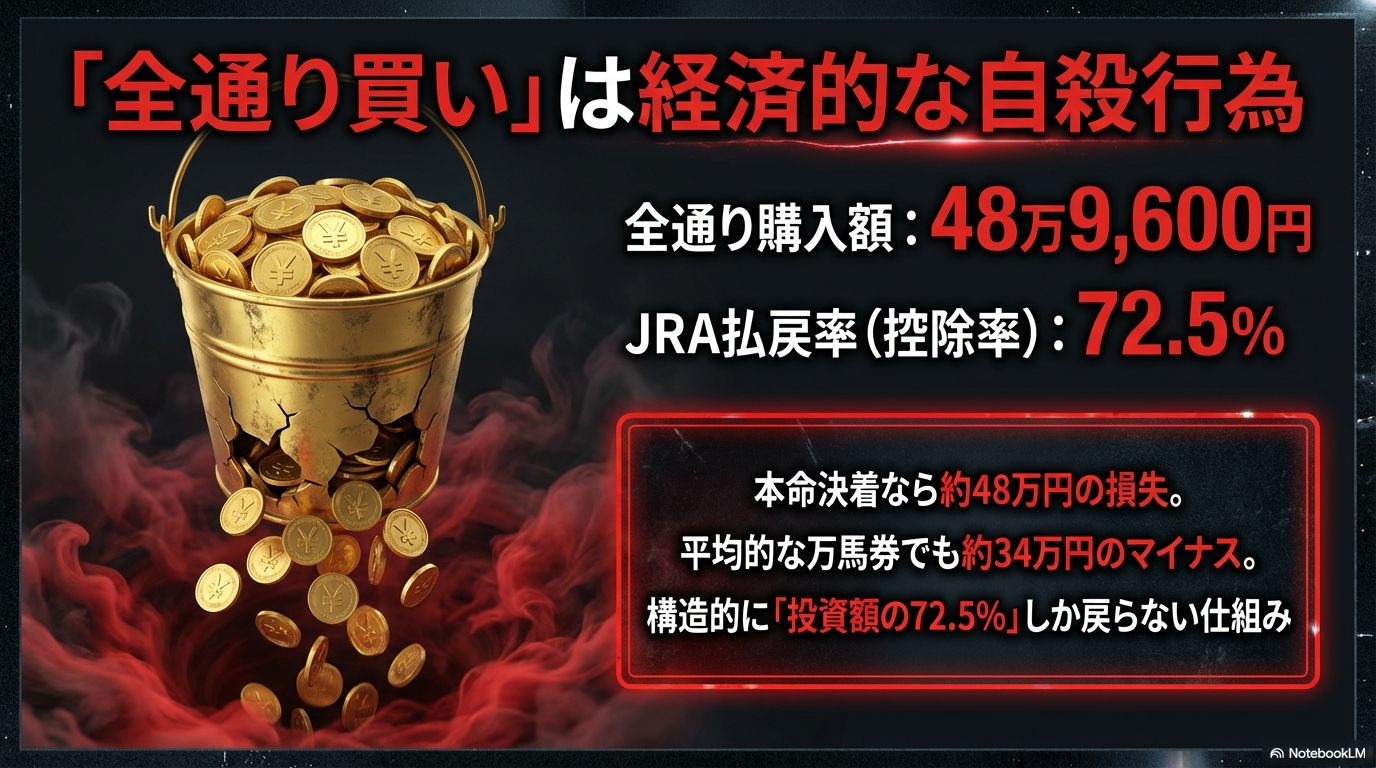 しかし、結論から申し上げますと、この手法は「経済的な自殺行為」に他なりません。なぜ全通り買いが最強の必勝法ではなく、破滅への入り口なのか。その理由を、具体的な金額と「控除率」という絶対的なルールの観点から徹底的にシミュレーションしてみましょう。
