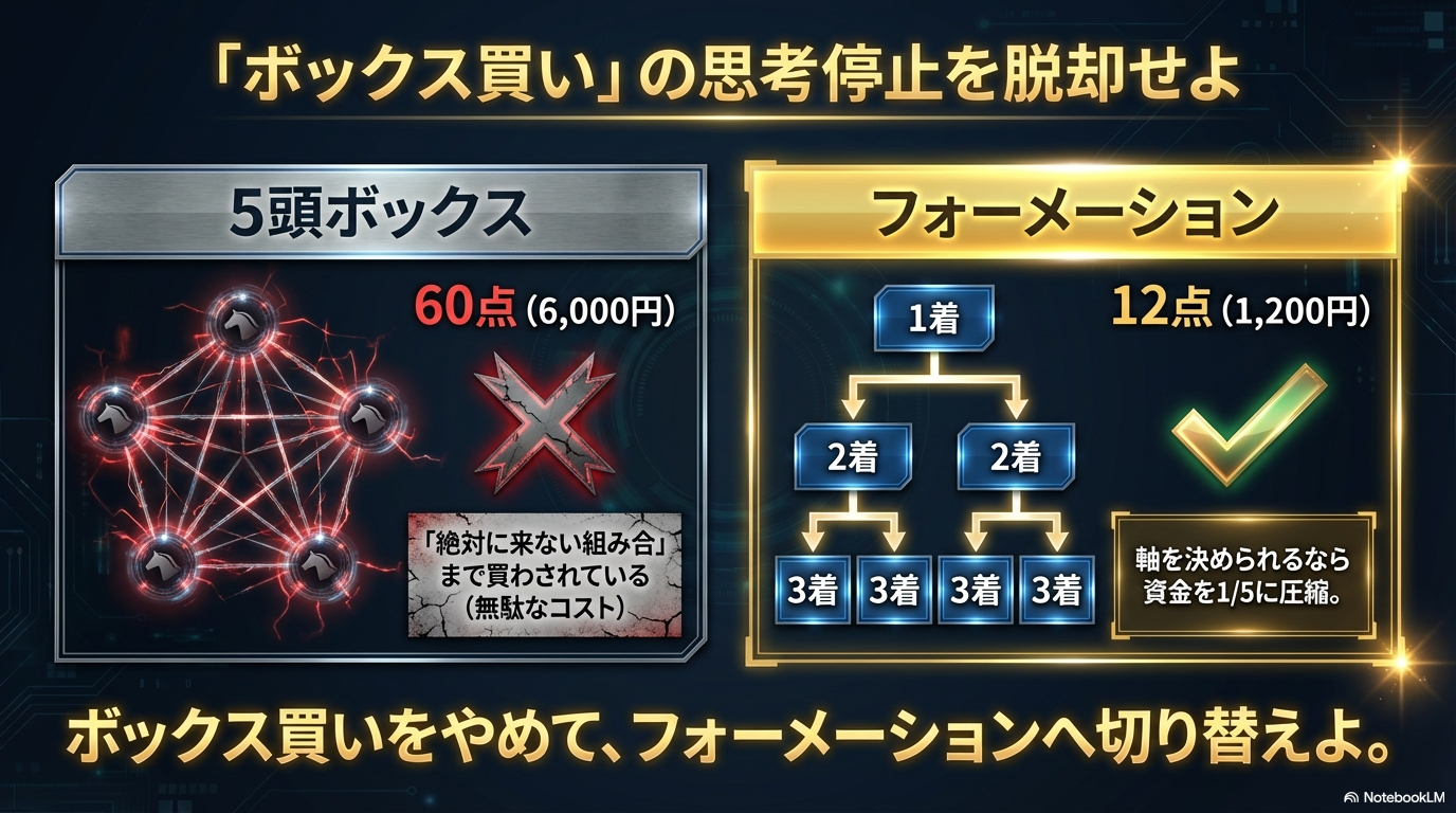 よくある失敗例が「5頭ボックス(60点)」です。6,000円という投資額は、競馬においては決して安くありません。
