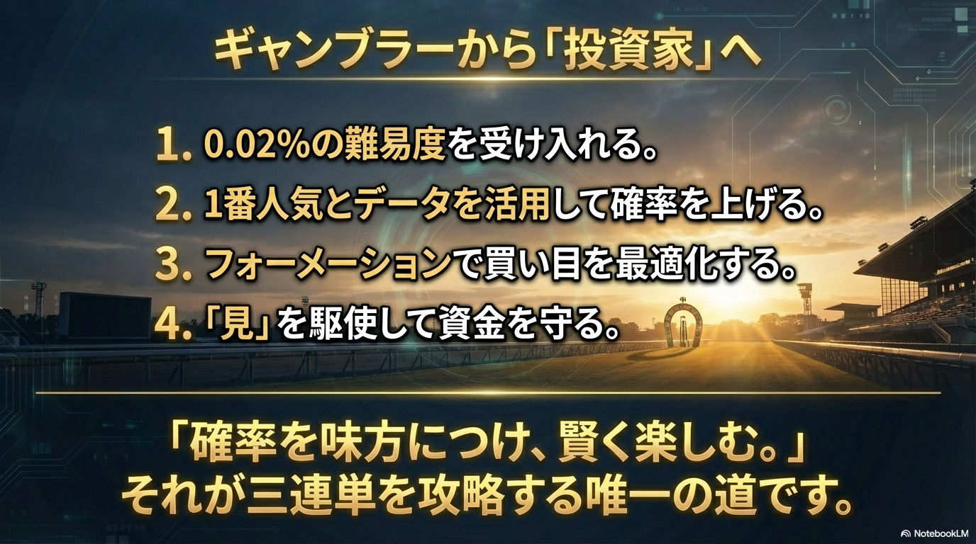ここまで、競馬の三連単における確率の真実と、それを攻略するための具体的な戦略について、長々とお話しさせていただきました。最後に、これら全ての知識を統合し、実際に明日からの競馬ライフで「確率を味方につける」ためのマインドセットについてお伝えしたいと思います。