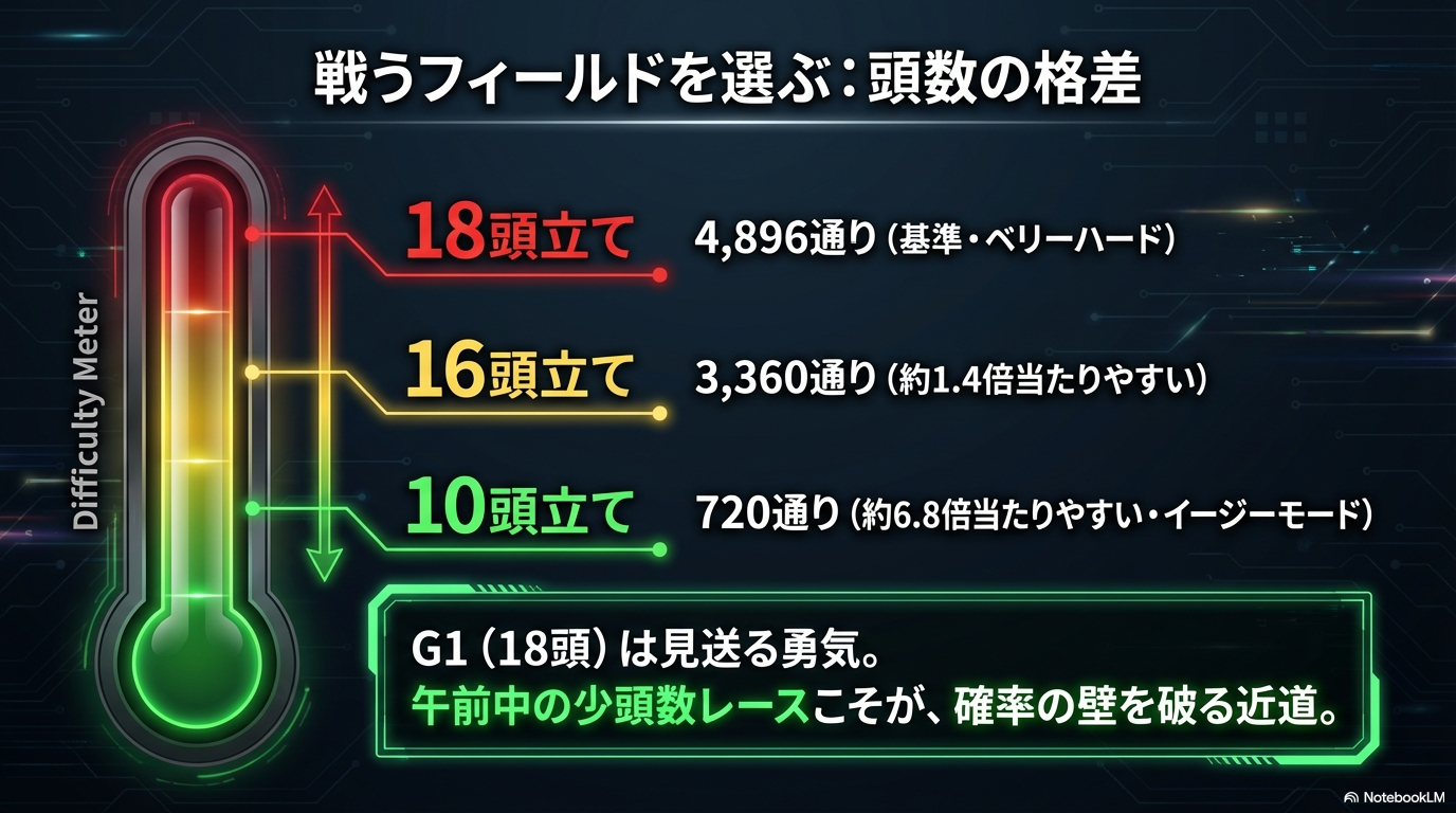 - 情報のフィルタリング:過去データやパドック気配から「来ない馬」を消去することで、分母(組み合わせ数)を物理的に減らす。
