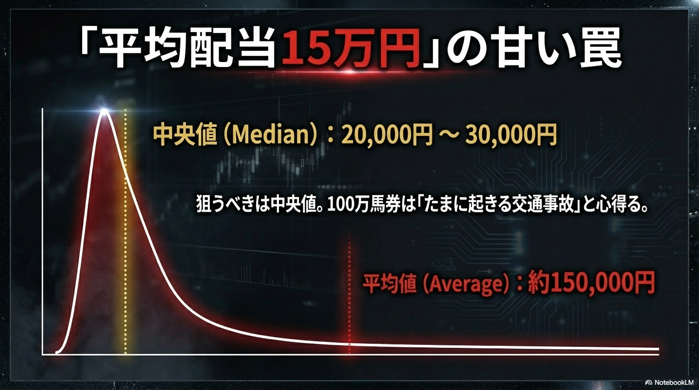 「毎回100円が15万円になるなら、適当に買っても儲かるのでは?」と錯覚してしまいそうですが、ここには統計学的な「平均値の罠」が潜んでいます。