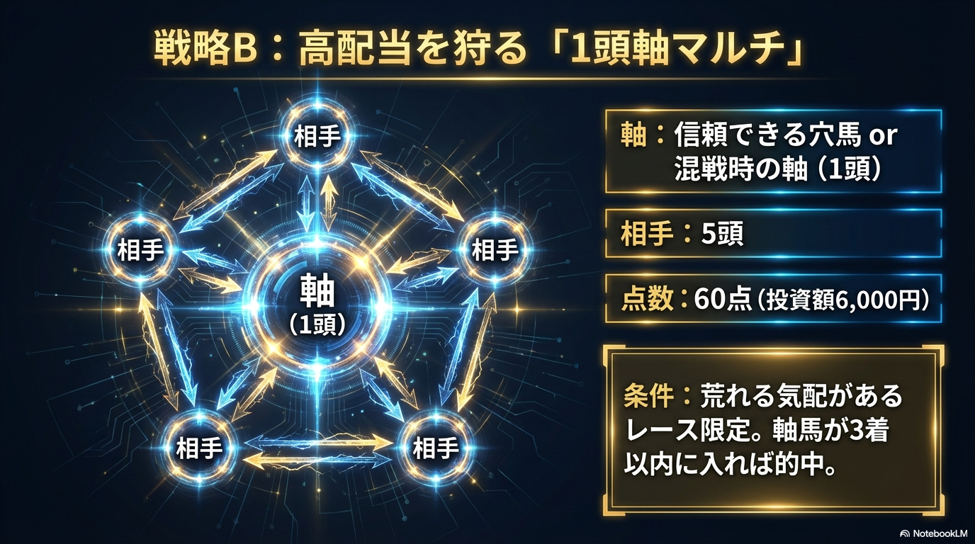 | 6頭ボックス | 6×5×4 | 120点(12,000円) | 高配当必須。リスク大 |